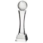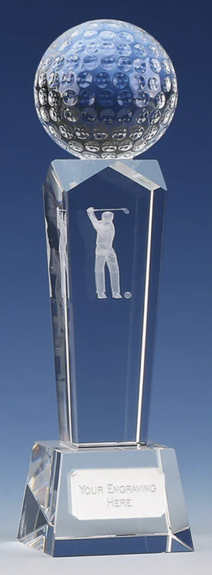 A great modern crystal glass golf award, featuring a glass golf ball mounted on a glass block with a male golfer image within.