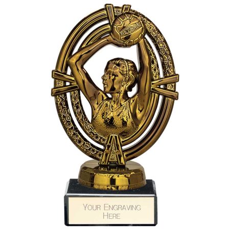 The Maverick Legend rugby legend trophy features a netball design on a black plinth, finished with golden details.