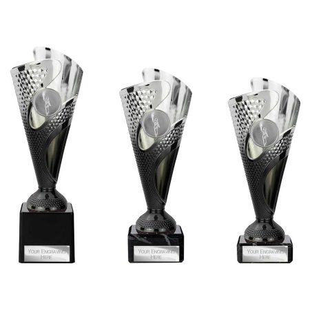 The Rodeo cone style cup with a black & silver cone over a plastic riser and black marble base.